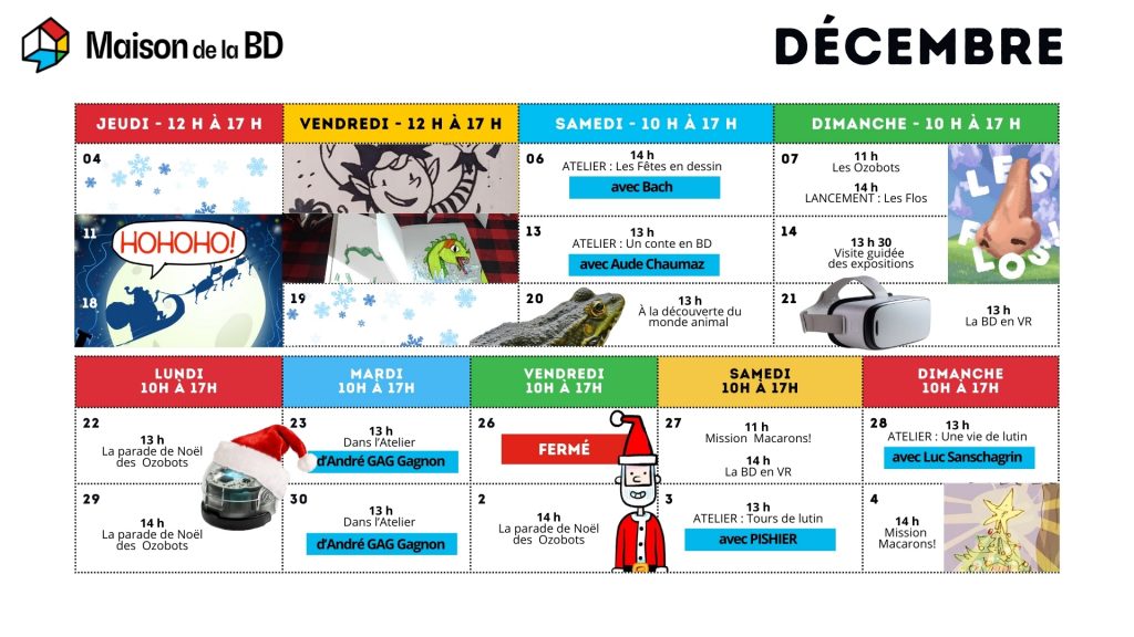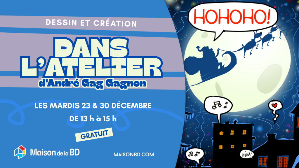 Avec l’arrivée des congés des Fêtes, la Maison de la BD ouvre ses portes et prolonge ses horaires pour proposer une programmation festive et grand public, du 20 décembre au 4 janvier. En plus des expositions en cours, qui présentent différentes facettes de la bande dessinée, plusieurs activités ludiques et ateliers créatifs sont offerts gratuitement jusqu’au retour en classe.