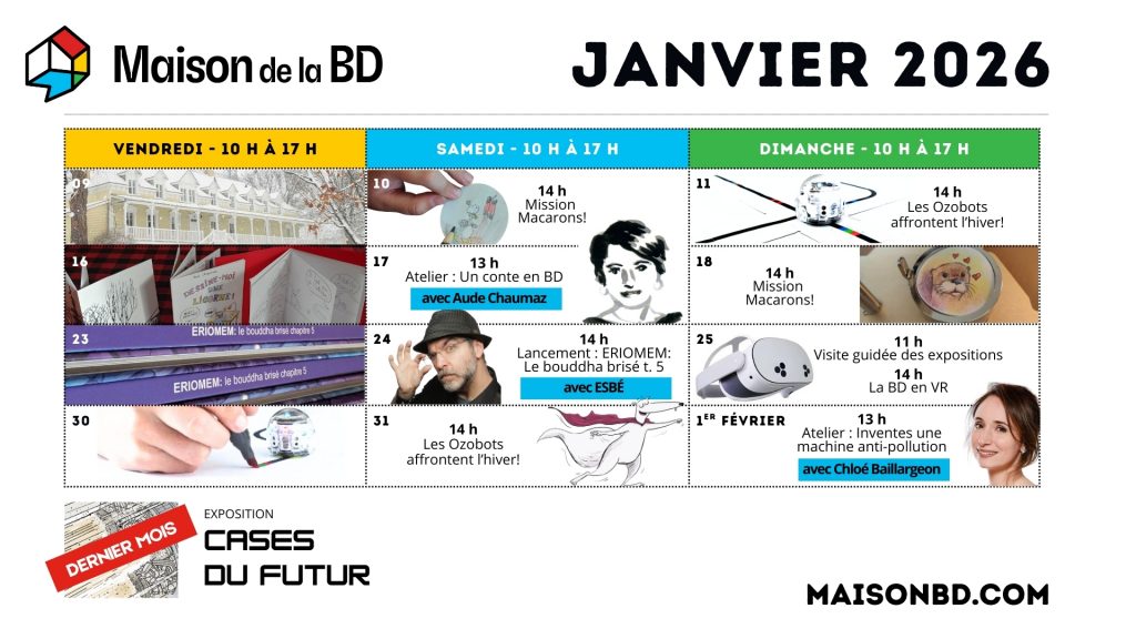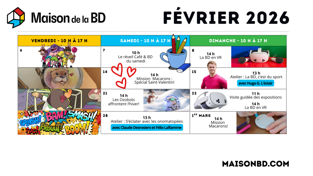 En ce début d’année, la Maison de la BD amorce sa première saison hivernale avec de nouveaux horaires et toujours de belles animations. En effet, en plus des expositions en cours, qui présentent différentes facettes de la bande dessinée, plusieurs activités ludiques et ateliers créatifs sont offerts gratuitement tous les weekends.