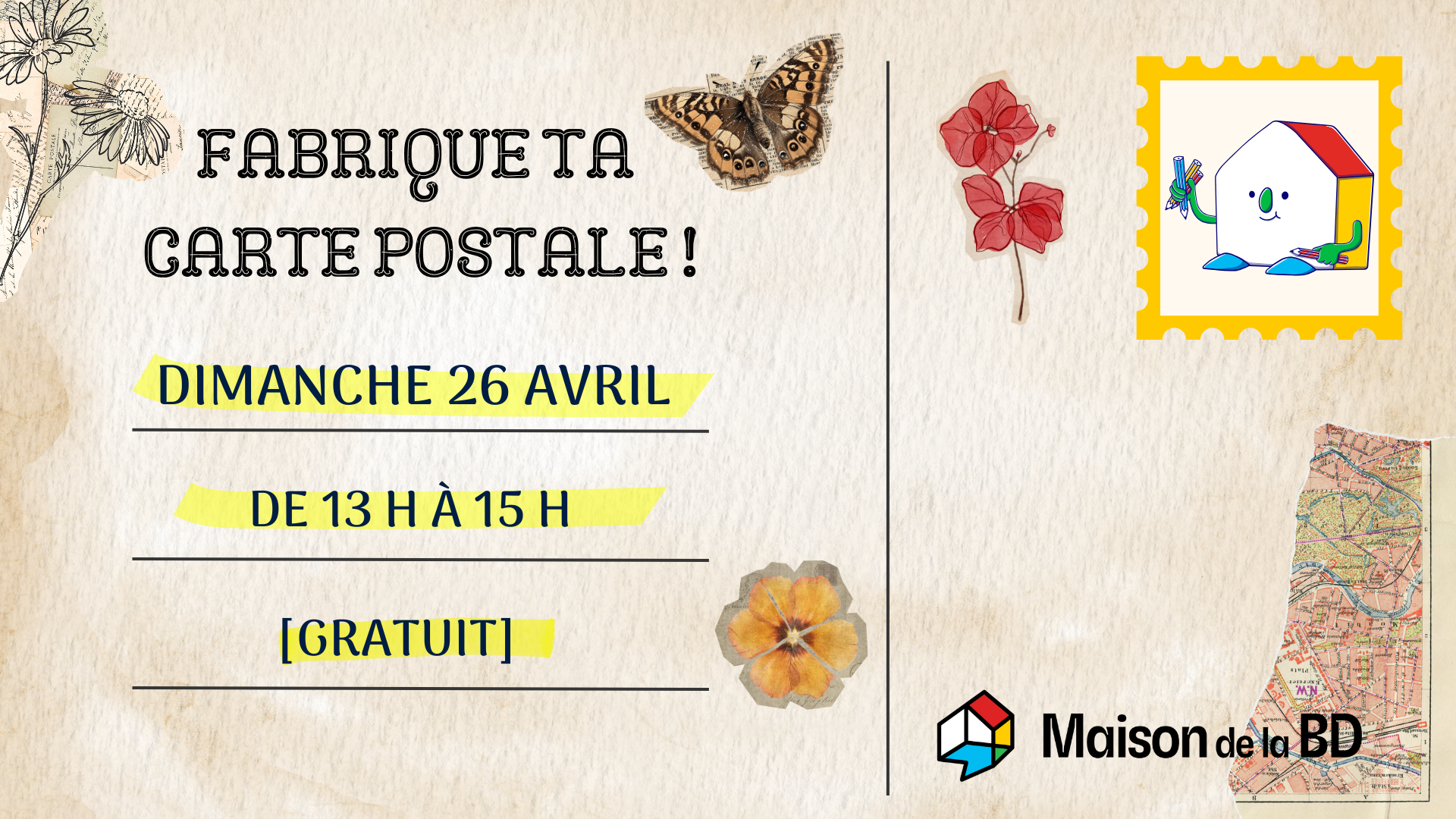 Inspirée par La femme aux cartes postales, une oeuvre mise de l’avant dans notre nouvelle exposition portant sur le travail de Jean-Paul Eid, l’équipe de la Maison de la BD vous invite à créer votre propre carte postale grâce au collage ! Une fois la carte complétée, vous serez encouragé·es à y inscrire un petit texte. Les personnes intéressées pourront même laisser leur création pour qu’elle puisse être consultée par les autres visiteurs du lieu.